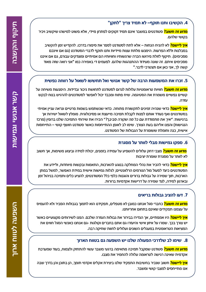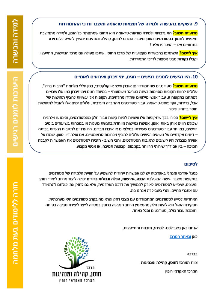 המרכז לחוסן קהילה ומנהיגות יצא בפרסום מסמך יישומי הכולל המלצות וכלים להתנהלות רגישה עם סטודנטים בתקופות של אי-ודאות ומתח. המסמך, שנכתב על ידי צוות המרכז בשיתוף ד"ר שירה פגורק אשל, מציע עקרונות בסיסיים לתקשורת מודעת-טראומה בתוך הקמפוס.