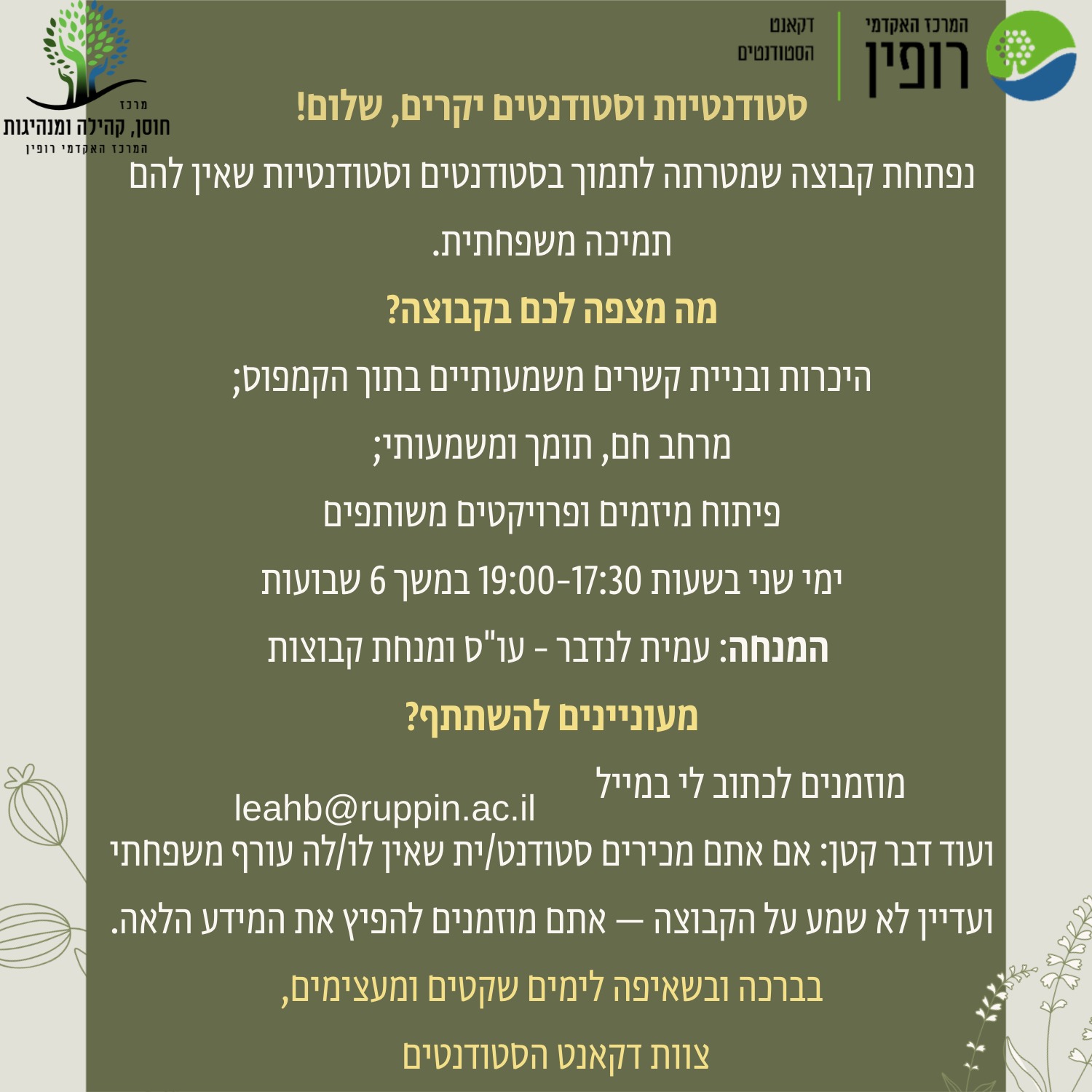 "ביחד בקמפוס: חיזוק תמיכה וקשרים"- סדרת סדנאות ייחודית המיועדת לסטודנטים וסטודנטיות המתמודדים עם לימודים אקדמיים ללא רשת תמיכה משפחתית. הסדרה מעניקה מרחב בטוח ומשמעותי לבניית קשרים, לשיח פתוח ולפיתוח חוסן אישי וחברתי. מטרת הסדנאות היא חיזוק תחושת השייכות בקמפוס ומתן כלים מעשיים להתמודדות עם אתגרי היום-יום במהלך הלימודים.
