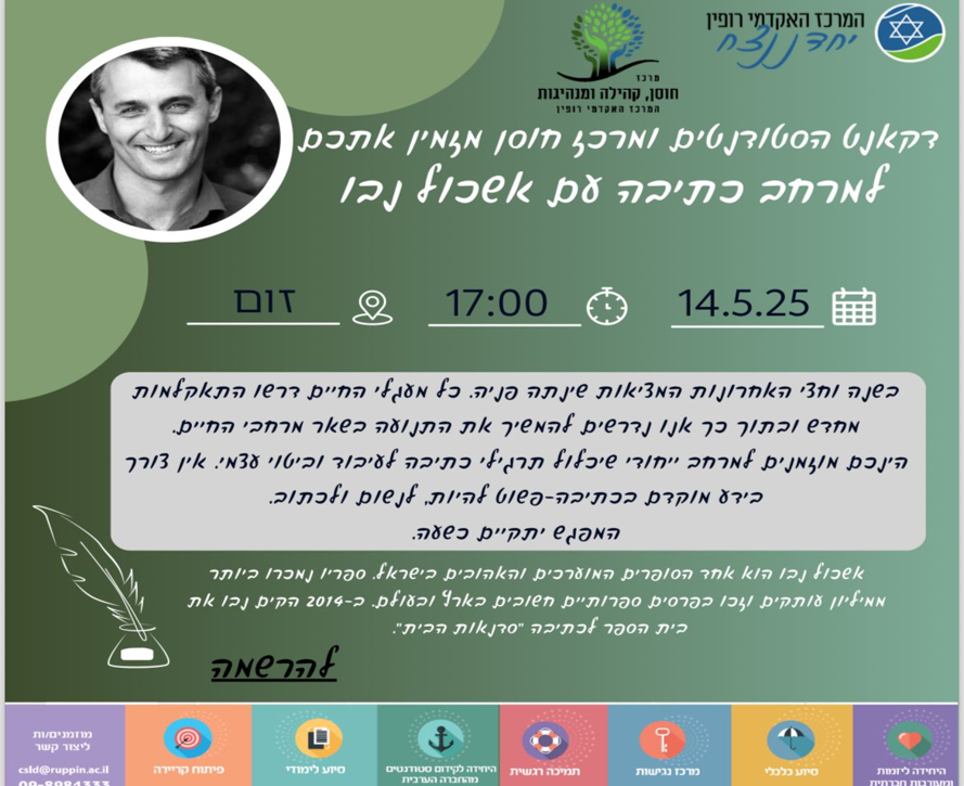 סדנת כתיבה בהובלת הסופר והמשורר אשכול נבו- בסדנת הכתיבה הייחודית של המרכז לחוסן ודקנט הסטודנטים התנסו חברי הסגל האקדמי, המנהלי והסטודנטים בכתיבה, שיתוף והקשבה הדדית. באמצעות תרגילים מונחים ושיח פתוח נוצר מרחב בטוח שבו המילים שימשו כלי לעיבוד חוויות, לחיזוק אישי וליצירת חיבור קהילתי – במיוחד בתקופות מאתגרות.