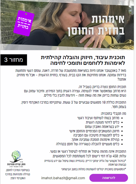 אימהות בחזית- סדנה תהליכית וייחודית המיועדת לאימהות של לוחמים, שהתקיימה בשיתוף המרכז לחוסן, קהילה ומנהיגות ועמותת 'אימהות בחזית'. במהלך הסדנה נלמדו ועובדו סוגיות הקשורות להתמודדות עם מתח, דאגה וחוסר ודאות, לצד זיהוי משאבי כוח אישיים ובניית נרטיב מחזק. הסדנה סיפקה מרחב תומך לעיבוד רגשי, לשיתוף ושיח, תוך הענקת כלים מעשיים לחיזוק עצמי ולהתמודדות יעילה עם אתגרים רגשיים.